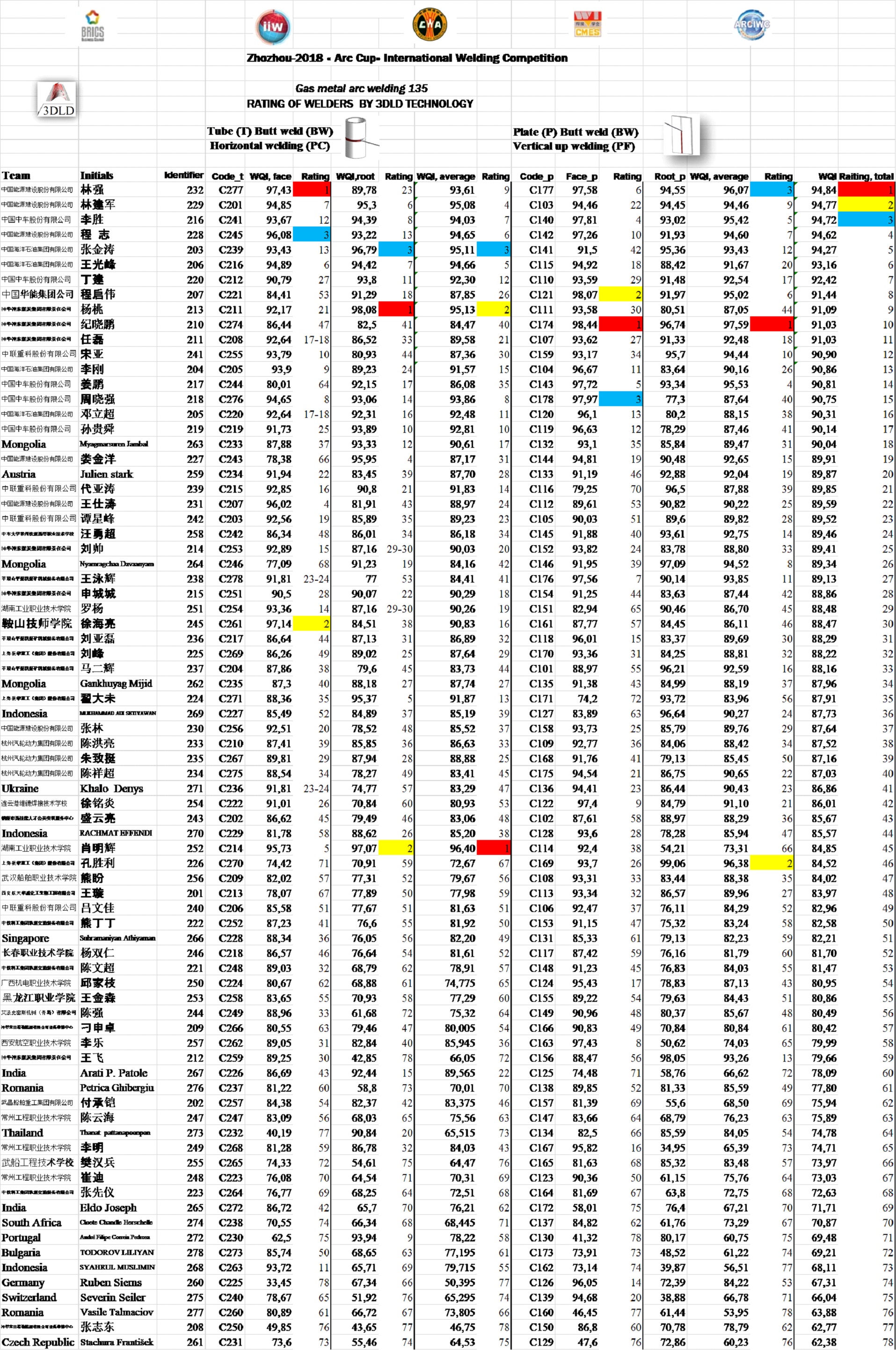 Победителями Arc Cup 2018 в трех номинациях, по версии 3DLD стали китайские сварщики. Ниже приведены Абсолютные чемпионы и мировые лидеры в 3 номинациях: