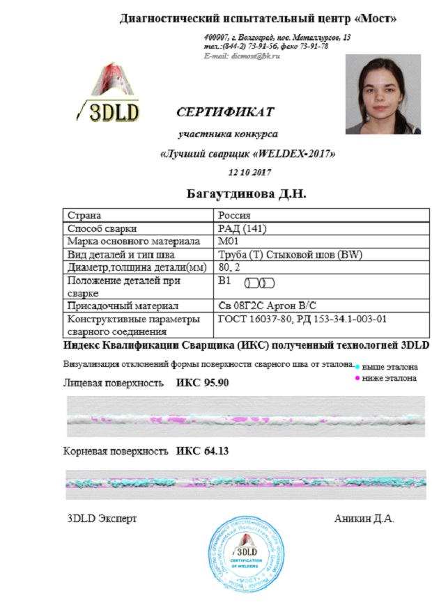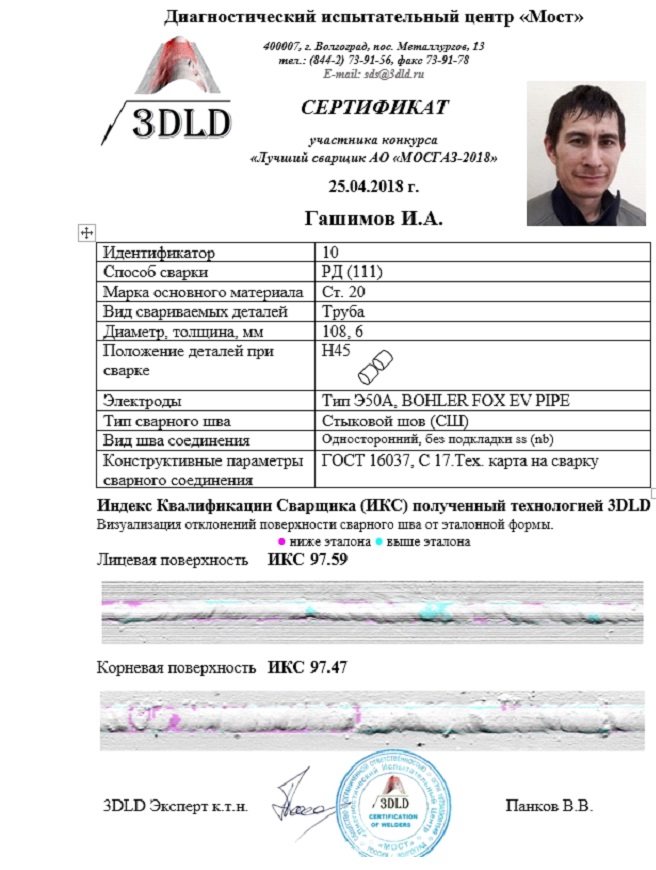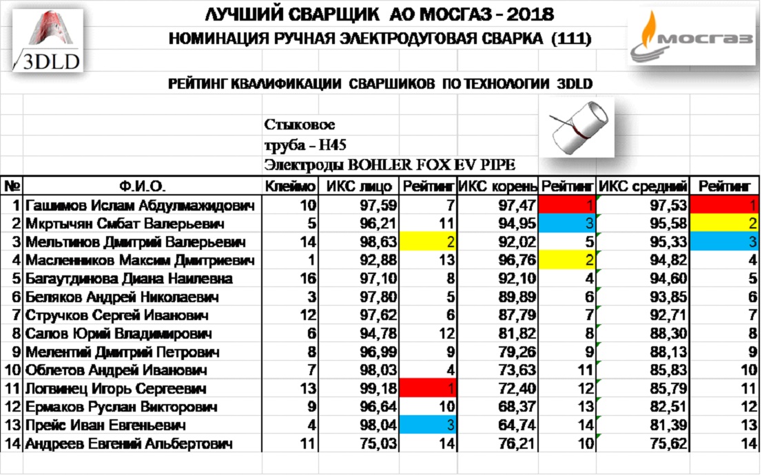 Для объективной и статистически достоверной оценки профессионального мастерства и ранжирования уровня квалификации сварщиков в номинации ручная дуговая сварка (РД 111), руководство АО «МОСГАЗ» приняло решение официально включить инновационную цифровую технологию 3DLD в Положение о проведении Конкурса профессионального мастерства электросварщиков 2018г. Годом ранее технология 3DLD применялась при определении победителей и ранжирования участников в Конкурсе сварщиков «Лучший сварщик АО МОСГАЗ 2017» факультативно, наряду с традиционными экспертными методами оценки. Результаты оценки по версии 3DLD были сведены в таблицу, определен победитель и рейтинг участников Конкурса.