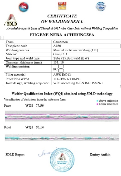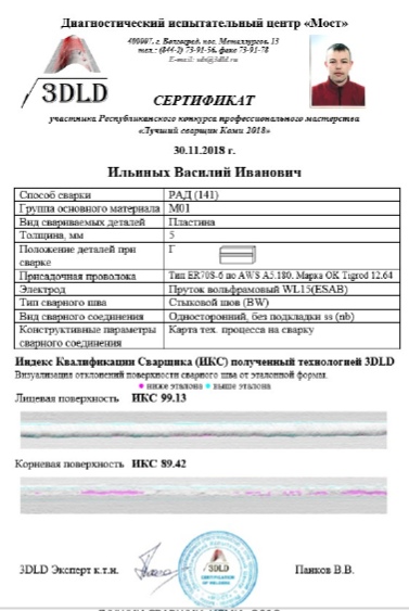Уважаемые коллеги, предлагаем Вам услуги по определению победителей и рейтинга конкурсантов при проведении Конкурсов сварщиков различного статуса с применением цифровой технологии 3DLD. Технология 3DLD имеет следующие преимущества перед традиционными экспертными методами: 1 Исключает субъективизм и неоднозначность оценки экспертами, при определении победителей конкурса. 2 Обеспечивает статистическую достоверность результатов оценки. 3 Определяет практические навыки сварщика цифровым индексом ИКС и визуально отображает отклонения формы сварного шва от эталона. 4 Сохраняет цифровую реплику формы сварного шва, выполненного сварщиком в электронном виде, что дает возможность оценить его квалификацию при различных правилах и нормах дефектности. 5 Позволяет сопоставить квалификацию сварщиков, с квалификацией сварщиков мирового уровня. 6 Процесс оценки автоматизирован и занимает не более 10 минут для одного контрольно сварного соединения, выполненного сварщиком. 7 По результатам конкурса сварщиков формируется рейтинговая таблица и сертификат для каждого конкурсанта в электронном виде. Основы метода изложены в статьях научных журналов, научно технических конференциях, семинарах и производственных совещаниях. Технология 3DLD в 2016- 2018г. применялась при определении победителей и рейтинга участников ведомственных региональных, областных и республиканских соревнований сварщиков РФ в г. Волгодонске, Волгограде, Таганроге, Домодедово, Москве, Сыктывкаре, а также международных соревнований сварщиков в г. Шанхай «Arc Cup» IWC 2017 г., Чжу Жоу «Arc Cup» IWC 2018 Технология 3DLD получила международное признание и включена в технический файл определения победителей и рейтинга участников международного соревнования сварщиков «Arc Cup» IWC. Технология 3DLD не имеет мировых аналогов и дает возможность создать единый квалификационный рейтинг сварщиков и определить абсолютного чемпиона по цифровому Индексу Квалификации Сварщика (ИКС/WQI). ИКС характеризует практические навыки сварщика в цифровом эквиваленте, как его способность (skills) формировать лицевую и корневую поверхность сварного шва заданных размеров, в заданном пространственном положении, из заданных материалов. Технология 3DLD — это процедура машинной оценки практических навыков сварщиков по форме поверхности сварного шва, основанная на сравнении цифровых реплик формы поверхности сварного шва, полученных сканированием лазерным датчиком (рис.1) с эталонной (бездефектной) формой, рассчитываемой по физико- математической модели (рис.2).